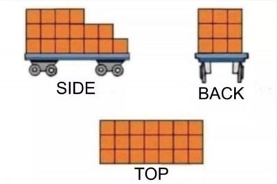 Bilden visar en sido-, bak- och uppifrånvy av lastbilen. Uppifrån kan man se 21 kvadrater. Det finns 17 på sidan och nio på baksidan.